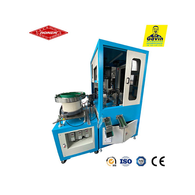 Czteroczkowana maszyna do sortowania nakrętki Ronen® wykorzystuje kamery do sprawdzania czteroklawowanych nakrętek. Wykrywa takie problemy, jak zgięte pazury lub nierówne wątki, a następnie rozróżnia dobre i złe orzechy. Gdy nakrętki zostaną wlane do maszyny, automatycznie sortuje je i umieszcza je w pudełkach.